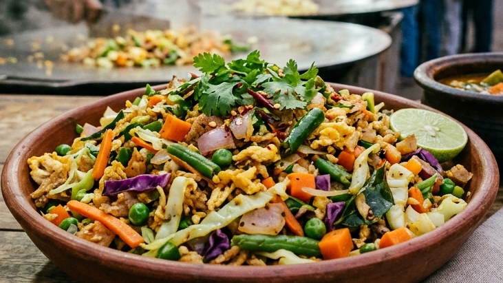 A vegetarian delight that doesn't compromise on flavor. Here, scrambled eggs are incorporated into the chopped roti along with an assortment of vegetables. The egg adds a creamy texture and a rich depth that complements the crispy roti and spices beautifully. It's a lighter yet equally flavorful option.